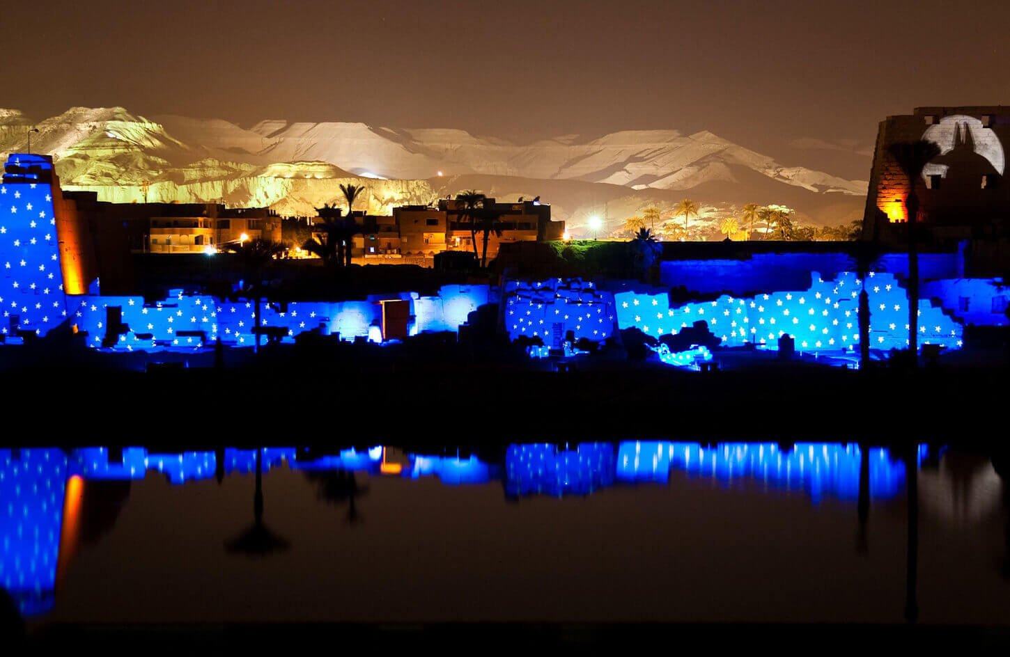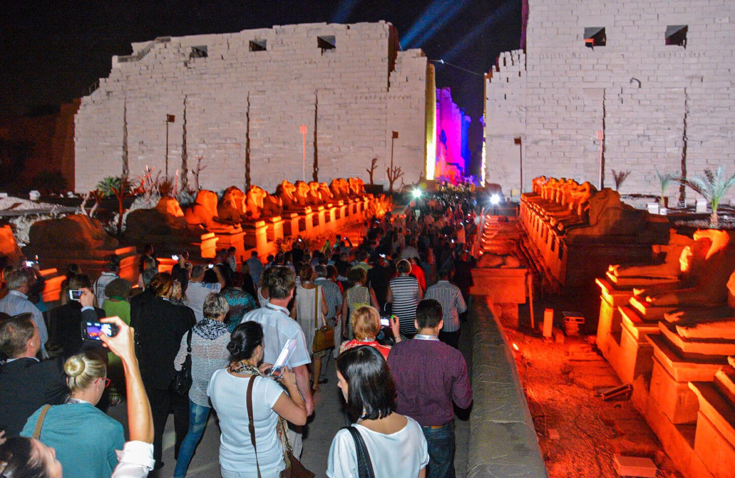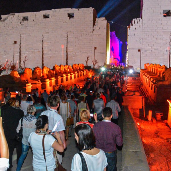 La fascinante historia de la antigua Tebas se muestra en el Espectáculo de Luz y Sonido de Karnak. El espectáculo narra las grandes hazañas de los faraones y describe poéticamente los tesoros antiguos. Mientras los visitantes recorren el complejo del templo, los faraones cobran vida y relatan sus historias, acompañados de una música misteriosa que envuelve toda la ciudad. Los sonidos antiguos y poéticos explican cómo se construyó Karnak y las obras de los faraones y del dios Amón, creando una experiencia mágica e inolvidable.