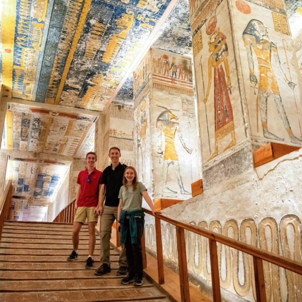 Durante el trayecto, disfrutará de un delicioso almuerzo en un restaurante local de calidad. Luego, se dirigirá a la orilla oeste del Nilo, comenzando con los Colosos de Memnón, enormes estatuas del faraón Amenhotep III, y continuando hacia el Valle de los Reyes, donde visitará tres tumbas destacadas, excavadas en la roca y ricamente decoradas con tesoros destinados al más allá.