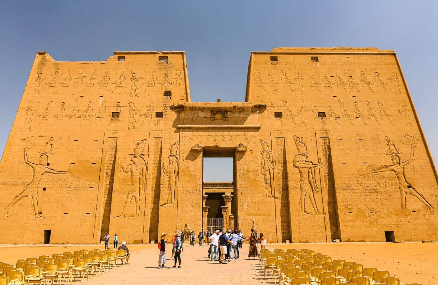 El Templo de Edfu, dedicado al dios halcón Horus, es uno de los templos mejor conservados de Egipto. Tiene 137 metros de longitud, 79 metros de ancho y 36 metros de altura. Es un ejemplo de la construcción típica de templos con edificaciones.