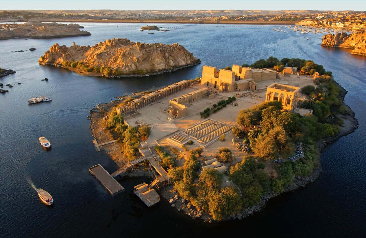 El asombroso Templo de Philae se puede ver en la isla de Philae, que se encuentra entre las Antiguas y Nuevas Presas de Asuán. Es uno de los templos más hermosos de Asuán y de Egipto en general. El templo fue trasladado a su ubicación actual después de la construcción de la Alta Presa, que amenazaba con sumergirlo permanentemente.