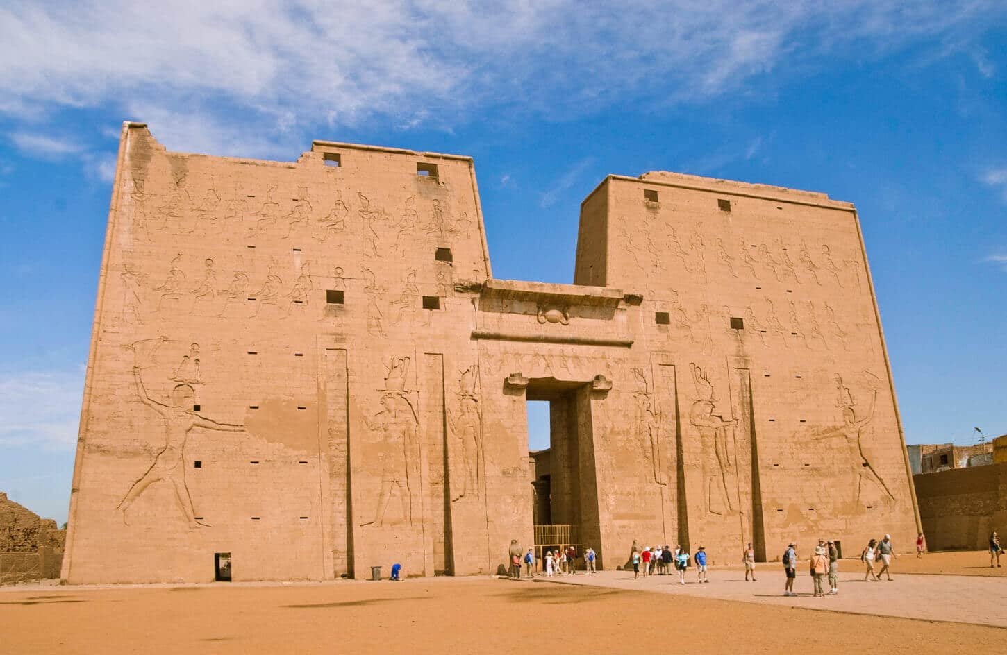 El Templo de Edfu, dedicado al dios halcón Horus, es uno de los templos mejor conservados de Egipto. Tiene 137 metros de largo, 79 metros de ancho y 36 metros de alto. Es un ejemplo de la construcción típica de los templos con edificaciones.